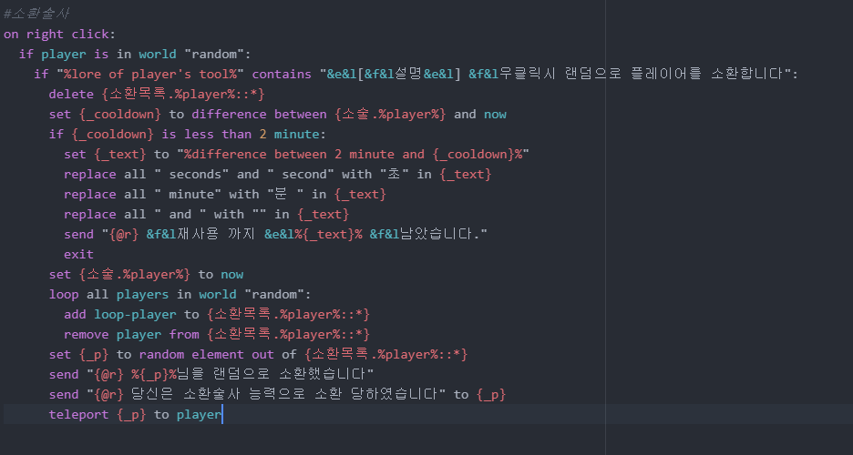 if "%lore of player's tool%" contains "&e&l[&f&l설명&e&l] &f&l우클릭시 랜덤으로 플레이어를 소환합니다":