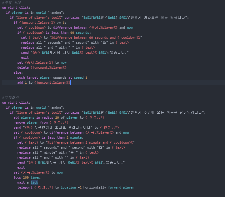 if "%lore of player's tool%" contains "&e&l[&f&l설명&e&l] &f&l우클릭시 주위에 모든 적들을 끌어당깁니다":
