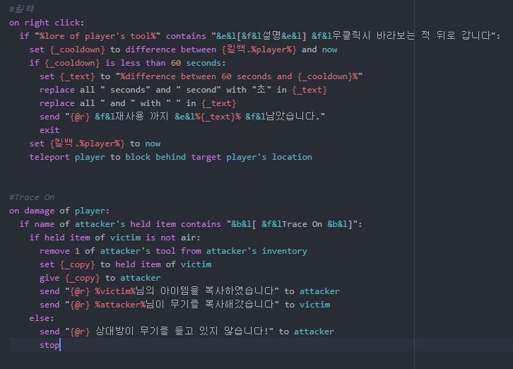 if "%lore of player's tool%" contains "&e&l[&f&l설명&e&l] &f&l우클릭시 바라보는 적 뒤로 갑니다":