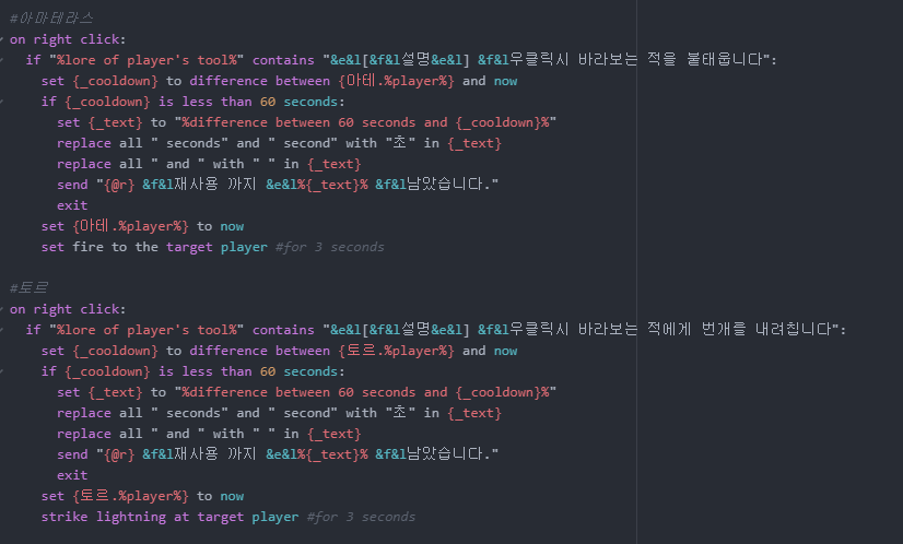 if "%lore of player's tool%" contains "&e&l[&f&l설명&e&l] &f&l우클릭시 바라보는 적에게 번개를 내려칩니다":