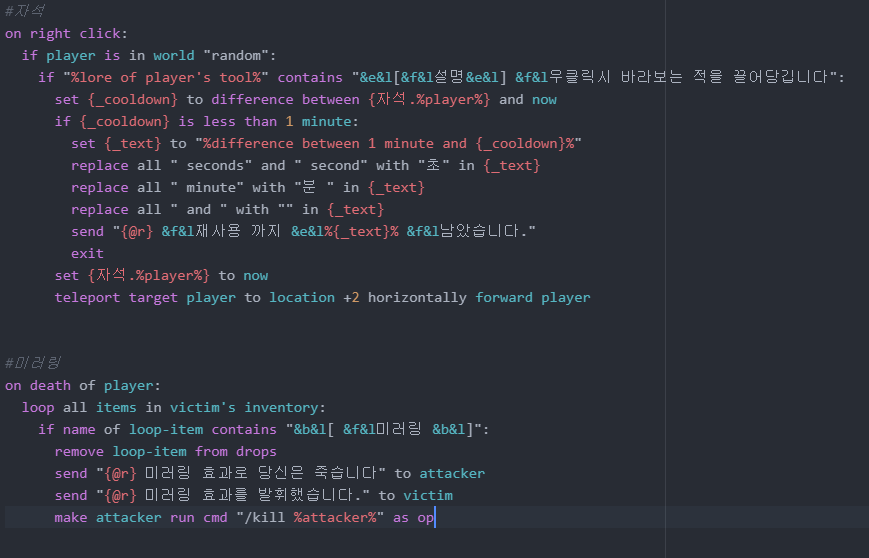 make attacker run cmd "/kill %attacker%" as op #그리고 피해자를 죽인 공격자는 자동으로 kill 명령어를 입력하여 사망합니다