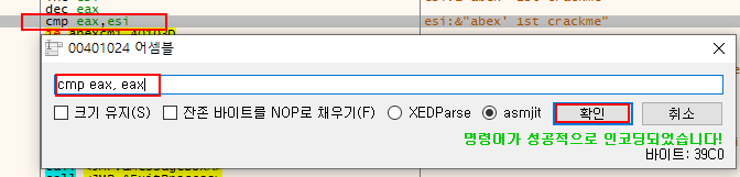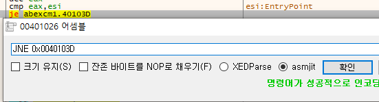 또 다른 방식으로 je 분기문 코드를 JNE로 수정하는 방법이 있습니다