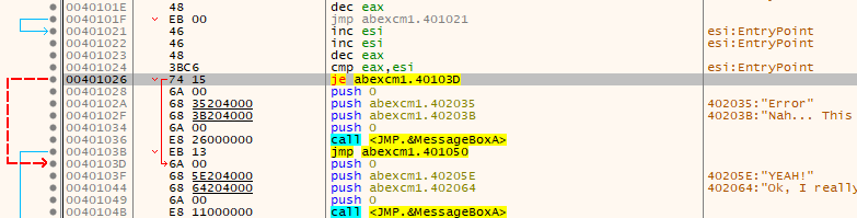 여기서 어셈블리 코드 흐름을 알아보면 앞서 eax와 esi 레지스터 값을 확인하여 서로 같다면 je 분기문이 작동되어 "YEAH!" 부분에 메시지 창이 뜨는 코드로 점프하는 걸 알 수 있다