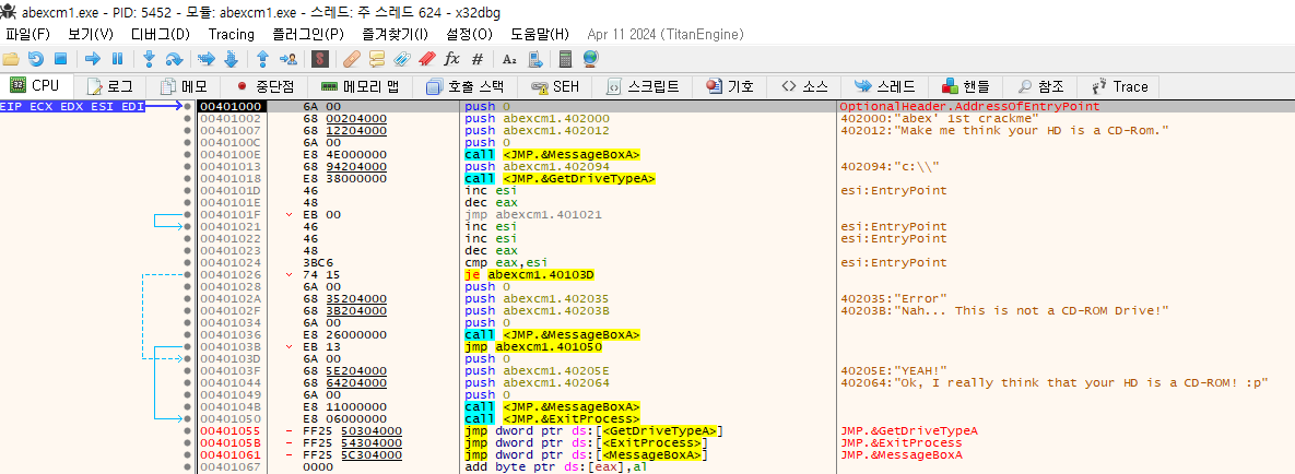 abexcm1.exe을 dbg에 넣고 F9를 누르면 EntryPoint가 존재하는 메인 함수까지 실행할 수 있습니다