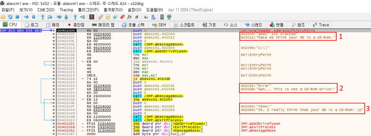 어셈블리 코드 좌측에 문자열을 살펴보면 앞서 abexcm1.exe을 실행했을 때 나오는 메시지 문구를 확인할 수 있다