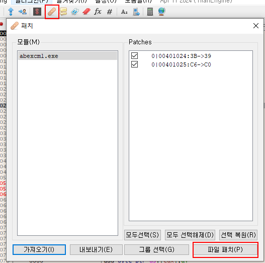 코드 수정이 완료되면 dbg 상단에 반창고 아이콘을 눌러 파일 패치를 진행해 줍니다