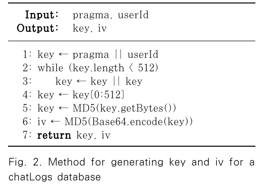 Fig. 1.과 같이 대화 기록 데이터베이스를 복호화하기 위해서는 key, iv 쌍을 생성해야 한다. pragma와 userId를 512바이트가 될 때까지 반복하여 연접한 후 MD5 해싱을 수행하면 key가 된다. key에 대해 Base64 인코딩 수행 후 MD5 해싱을 수행하면 iv가 된다. 구체적인 알고리즘은 Fig. 2와 같다.