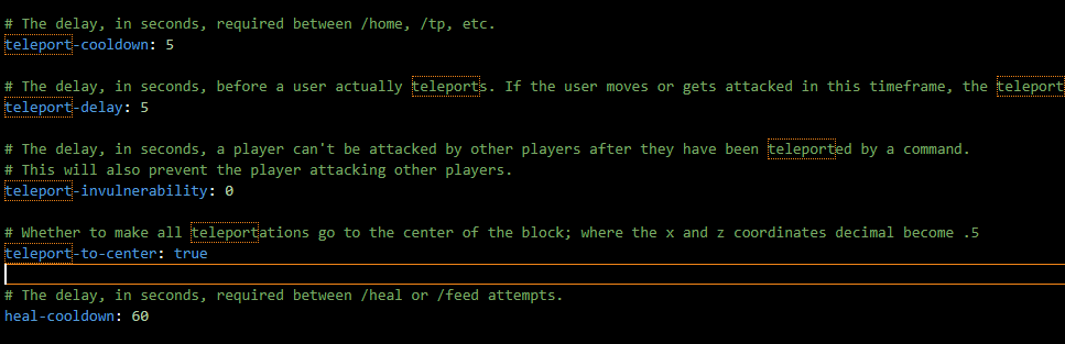 teleport-cooldown , teleport-delay부분을 5로 수정하고 ( home,tp,spawn 사용시 5초 쿨타임 )