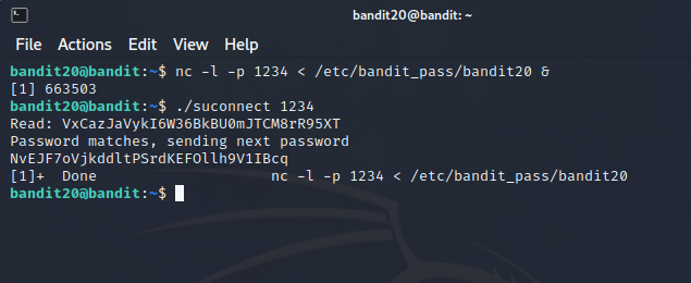 nc -l -p 1234 < /etc/bandit_pass/bandit20 & : 임의의 포트 1234를 열고 listen 합니다 listen 한 것을 다시 background로 돌리기 위해 명령어 줄 마지막에 & 기호를 추가한 겁니다