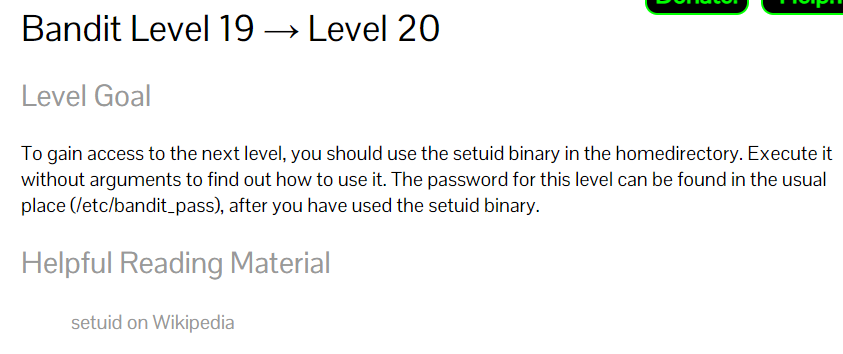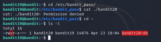Bandit Level 19 → Level 20 문제는 홈 디렉터리의 setuid 바이너리를 이용하여 /etc/bandit_pass 경로에서 bandit20의 패스워드를 읽어내는 문제입니다