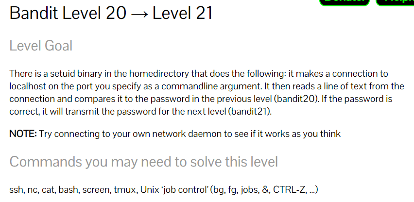 Bandit Level 20 → Level 21 문제는 홈 디렉터리의 있는 setuid 바이너리 파일을 명령 줄 인수로 실행하여 지정된 포트 localhost에 연결합니다 그 후 이전 수준의 암호가 맞는지 체크하여 맞으면 다음 레벨의 패스워드를 획득할 수 있는 문제입니다